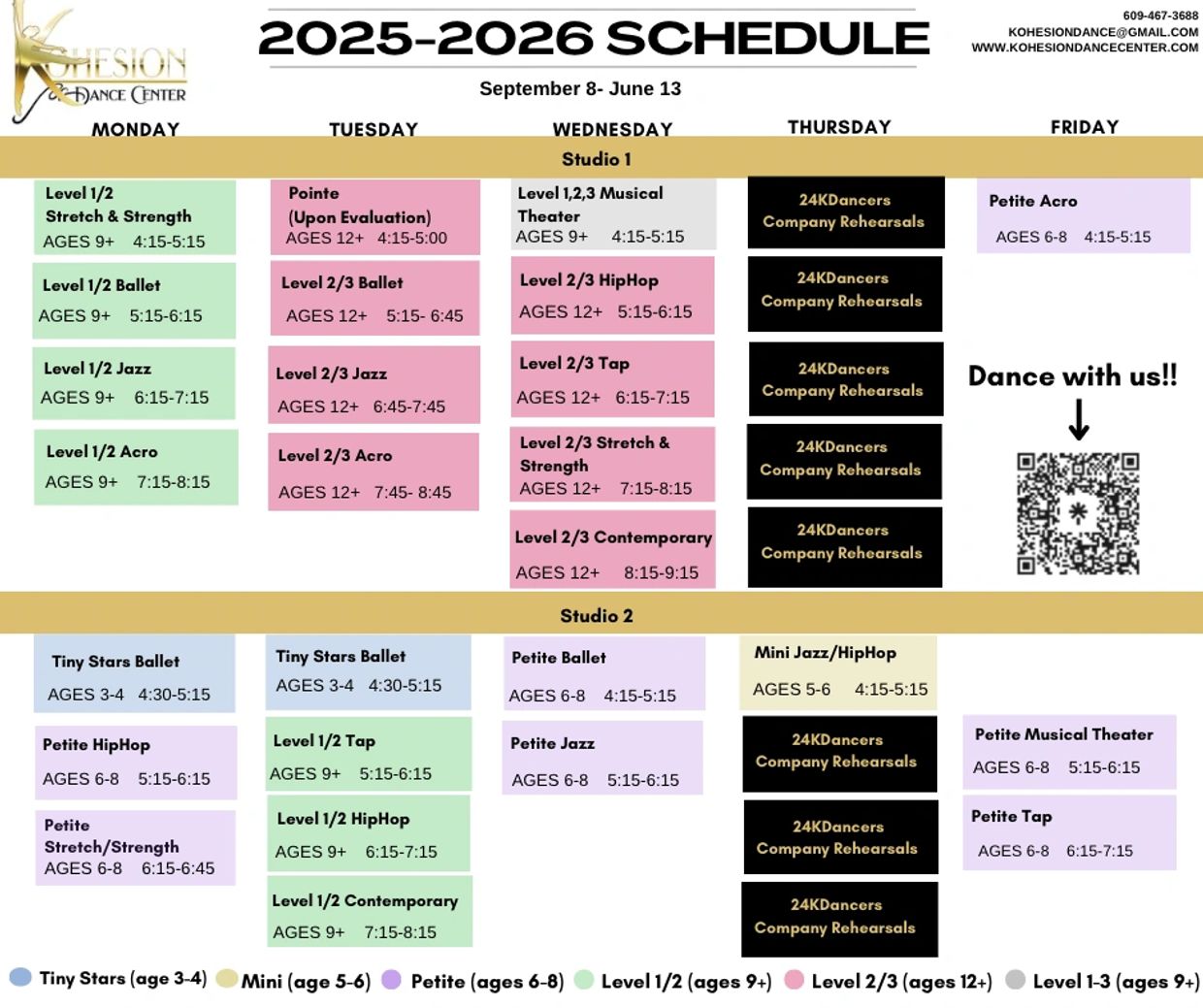 At Kohesion Dance Center, we strive to provide a welcoming and inclusive environment for dancers of all ages and skill levels. Our goal is to help our students develop their dance skills, build confidence, and foster a love of dance that will last a lifetime. JOIN THE KDC FAM!!!